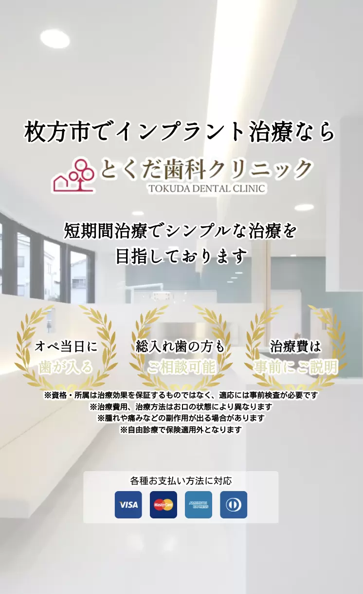 手術後に、痛みや腫れ、出血、合併症などを引き起こす可能性があります。噛む感覚がご自身の歯と異なる場合があります。見た目がご自身の歯と異なる場合があります。メインテナンスを継続しないと、抜け落ちる可能性があります。